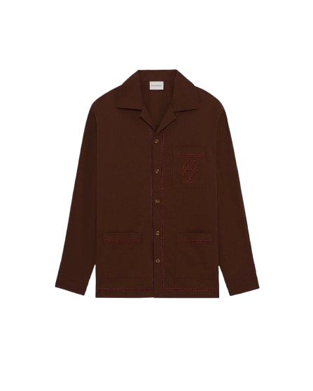 Cette chemise marron à manches longues en coton mélangé est ornée d’une broderie Échelle. À col ouvert, elle présente un boutonnage simple à cinq boutons, trois poches plaquées, une broderie « D » miroir sur la poche haute et deux boutons à chaque poignet.