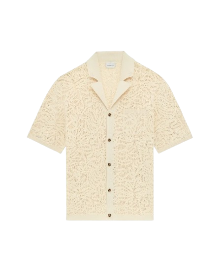 Conçue en 100% coton, cette chemise blanc cassé à manche courtes en maille effet dentelle a un col ouvert, un boutonnage simple à cinq boutons et une poche plaquée.