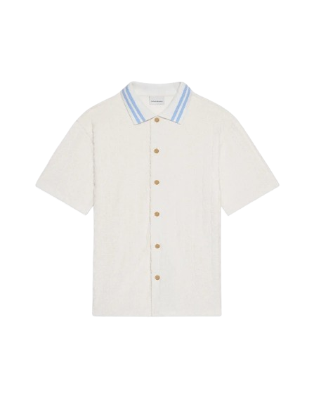 Cette chemise blanc cassé manches courtes 100% coton est réalisée en tissu éponge monogrammé. De coupe loose, elle est dotée d’un col chemise contrasté et d’une fermeture à six boutons pression gravés à l’avant.