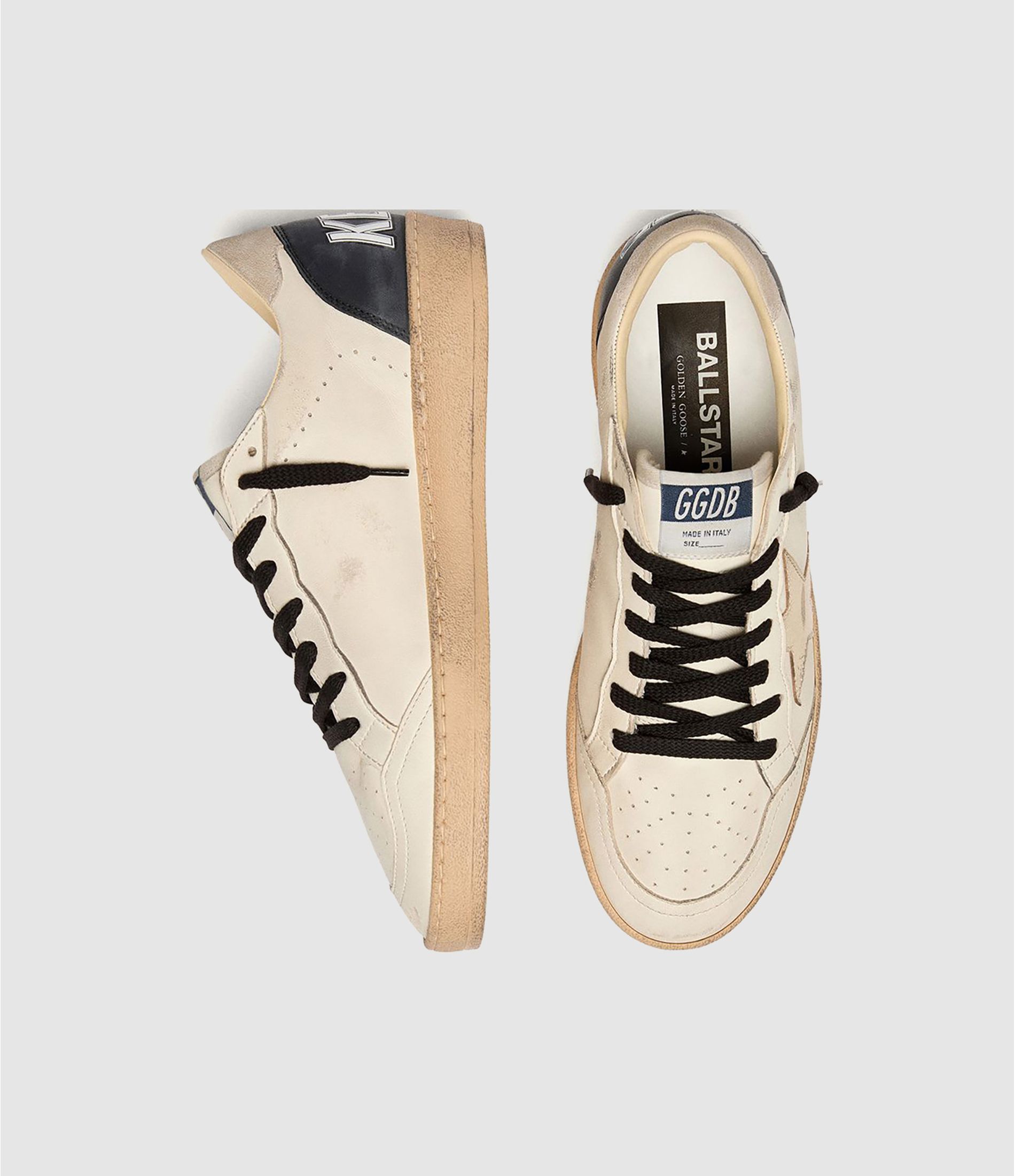 Rêvez des années 1980. Nos sneakers Ball Star font référence à l’esprit des universités américaines, entre un tir au panier et un tour en skateboard. Ce modèle, doté d’une tige en cuir nappa blanc, se distingue par l’étoile en daim bleu et le contrefort en cuir lamé platine. Les empiècements en cuir craquelé blanc.